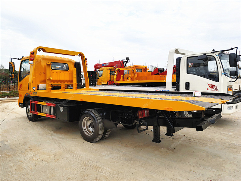 上裝配置:重汽豪沃清障車上裝藍牌平板一拖二型,平板長度為5.2米(含液壓伸縮尾板 或 液壓翻轉尾板 或 熱銷一體板),3P2A折疊沖壓式平板。采用國標優質碳鋼多塊沖壓板制作或新型一次成型沖孔板,既減輕了整車重量,又增加了托舉和裝載能力。承載質量為3-4噸,平板最小傾斜角為8度,采用40KN液壓絞盤,加粗鋼絲繩21米,一個工具箱,一個洗手箱,該車配備新款4個綁帶,L型抱胎架1對,后工作燈2只,可選裝LED長排警燈,其余標配。