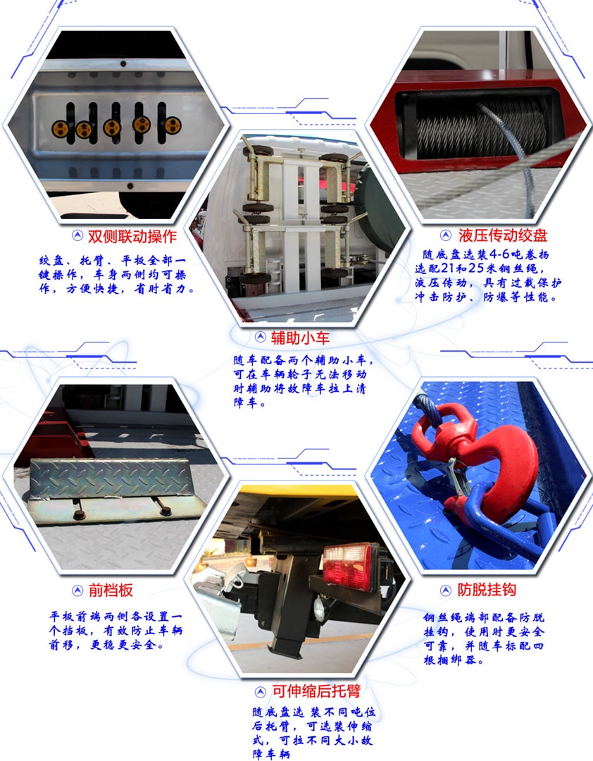 補充說明:特點1:多路閥、平衡閥采用意大利原裝進口件(湖北唯一進口液壓件的清障車